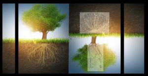 Figure 4: The nerve tree is upside down, where the leaves are the periphery of the body, the trunk is the spinal cord, and the brain is the roots. (Image by Lina Amy Hack, with images by Kamila Balmukasheva, zzayko, and andreusK on istockphoto.com.)