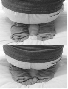 Homework: As noted, a Short-arch External often takes a while to access the ADM, so the abduction movements are key. But the toe box often can’t open because it’s stuck at an awkward angle by tight extensors. So I want the toes to flex, yes? But a short arch generally involves tight flexors. So instead of picking things up with toes, I encourage clients to Plantar Flex their toes passively. I have them sit seiza – sitting on their knees on a flat surface with the feet tucked under and toes passively flexed (see Figure 5.) Better that extensors release than be overruled by already-overworked flexors. But as seen in Figure 6, it is important to keep the feet straight (A) instead of touching the big toes together (B) as Japanese people often do. We’re not doing tea ceremony! A seiza bench might be necessary for starters. As the cliente is able to go lower down, one can use a rolled up towel under the anterior ankles. But the goal – in terms of what supports the ankles – is to have nothing there.