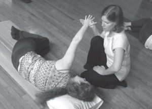 We took that idea and we played with it during 30-plus hours of exchange, spread out over three months. A bit like kids hanging out in a tree-fort, we negotiated our play, made up our rules, and figured out how to navigate within our newly invented “universe.” During that three-month period, we also experimented with solo practice and with applications of “our toy” in our respective practices. (I worked with my SI clients, and he worked with his qigong students.) Then, we developed a five- hour upper-body beta class for a mixed group of manual and movement arts practitioners, followed by a similar four-hour test class for a different group of practitioners. (Marilyn Beech, Certified Rolfer® and Anita Boser, Certified Hellerworker, shownin Figure 1, were in this first beta class and offered valuable feedback.)