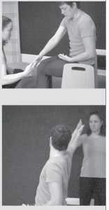 In the partner-facilitated form of DFR, there are two roles: the Doer/Active Receiver and the Facilitator. The Doer in this work (the client, if practicing in an SI setting) is the more active agent of change, whereas the Facilitator is the observer/ coach, the person who provides a tactile reference, directing vector, pace, and amount of resistance through touch. (If you have experience with contact improvisation dance, you will immediately understand this sort of tactile leading and following.) Facilitator and Doer also talk during the work, to negotiate and coordinate their efforts, but much of the communication is purely physical.
