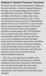 The investigator, a student from the weekend workshop, was working with a client who had a neck rotation issue, and the practitioner just hadn’t been able to sort it out yet. She reported that she used the seated thoracic torsional arc (see Sidebar 4 for full description of arc), and she didn’t have the client do anything special with her neck, just did the thoracic twist. She was thrilled to discover that when they were done, the client’s neck swiveled almost normally.
